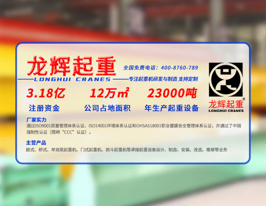 山東龍輝起重可根據用戶需求訂制各型號非標起重機,主營通用單雙梁、橋門式起重機、冶金起重機、防爆起重機、歐式起重機、潔凈起重機、智能全自動抓斗起重機、集裝箱龍門吊等產品的設計、研發、制造、銷售、改造、安裝維修保養等業務。